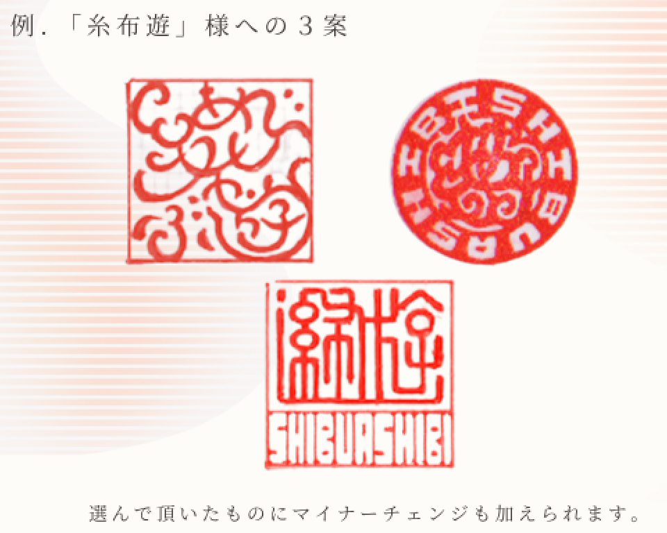 作品集をご覧の通り、当店のハンコはどこにもないデザインしかありません。これができるのは、彫刻するまでにお客様との打ち合わせを重ねるからです(ご注文から納品までの流れはこちら)。大切なものですから、家作りと同じ感覚でやっています。ご注文を頂いた後に、デザインのイメージやお客様の想い、そしてデザイン要望(柔らかい感じなど)をヒアリングしております。そこから当店が作るデザインは少なくとも3案、しかもどれも全て異なります。お客様には様々な選択肢の中から選択をして頂くので、これまでずっと喜んで頂いております。